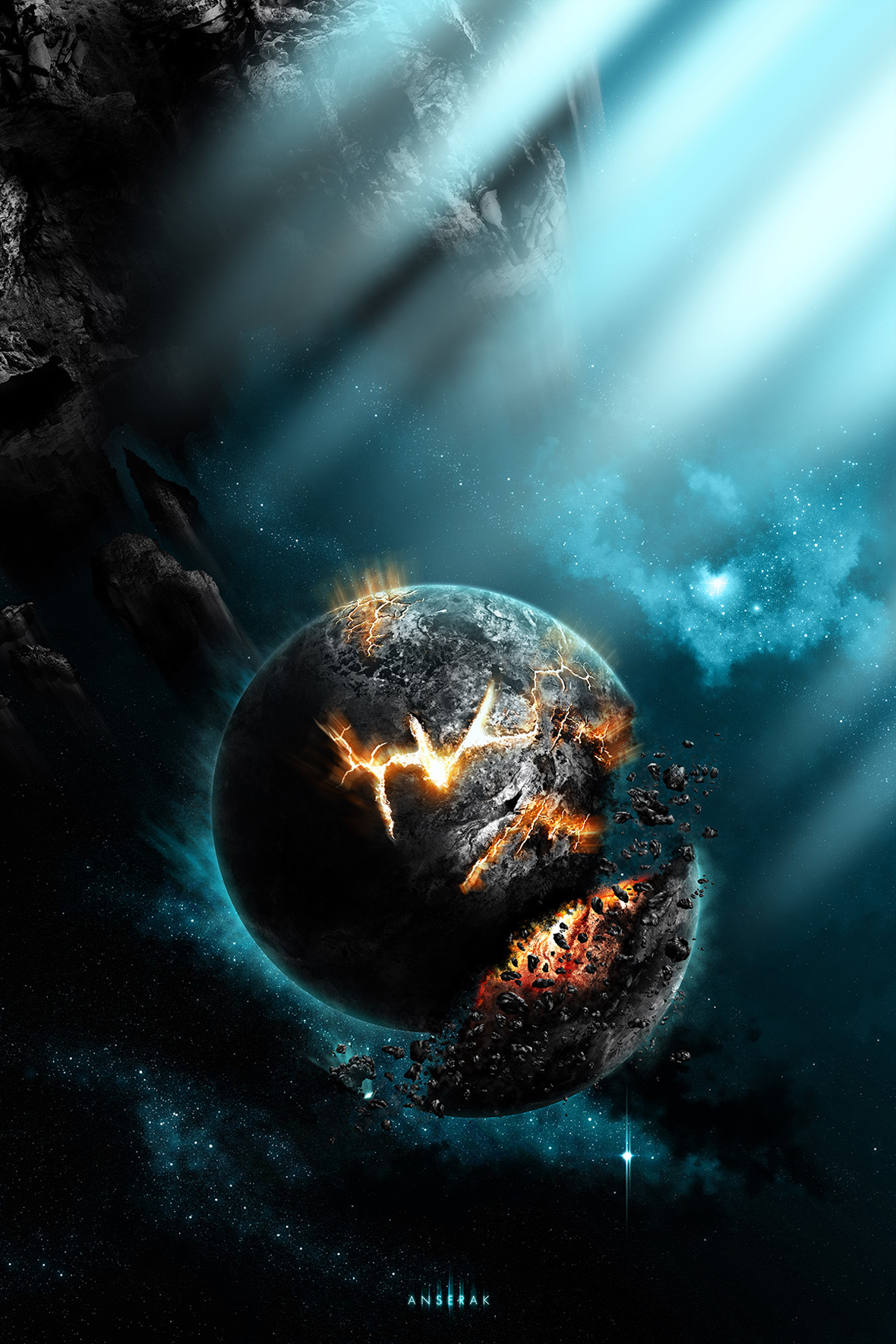 Anserak est ma seconde création de space art. Désirant jouer sur des micro-détails visibles seulement en s'approchant du support, le poster a été réalisé sur des dimensions de 170x254cm à 300dpi, soit un fichier de 20,000 x 30,000px.